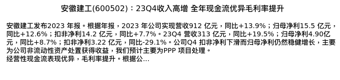 值得注意的是:2024年04月广发证券的耿鹏智/谢璐/尉凯旋分析师,首次发布关于安徽建工的研究报告,标题为:安徽建工(600502):23Q4收入高增 全年现金流优异毛利率提升。