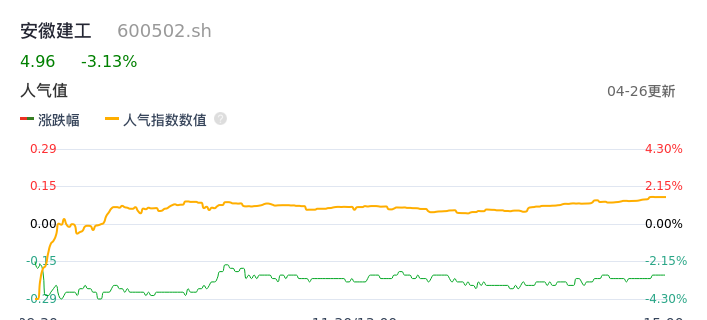 04月26日,安徽建工收报4.96,股价涨幅-3.13%,成交金额4.11亿元,换手率4.84%。