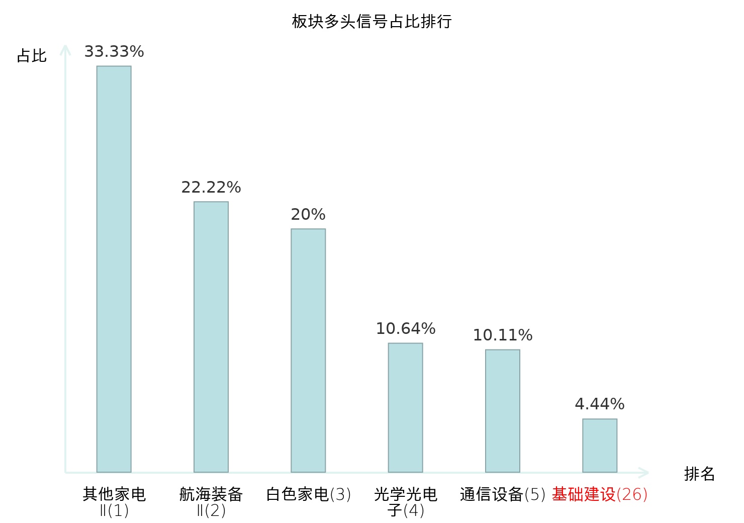 全市场所有行业板块中主力多头信号占比排名中,其他家电Ⅱ板块位居第一。其他家电Ⅱ板块名次提升最快,较昨日上升128位。