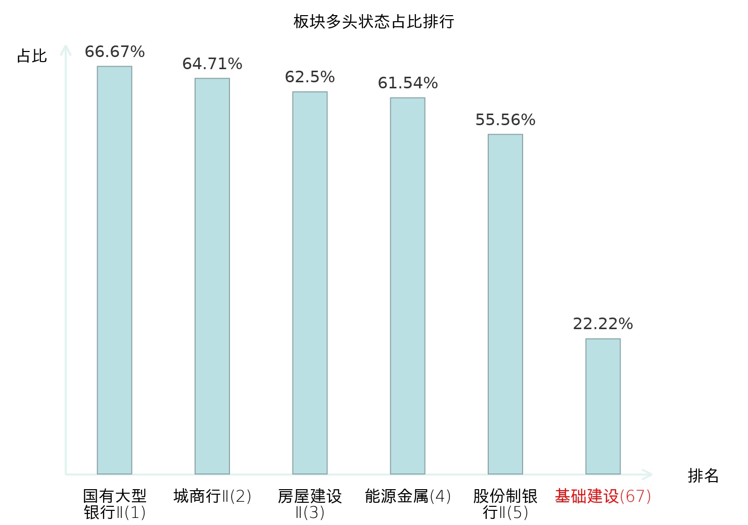 全市场所有行业板块中主力多头状态占比排名中,国有大型银行Ⅱ板块位居第一。普钢板块名次提升最快,较昨日上升65位。