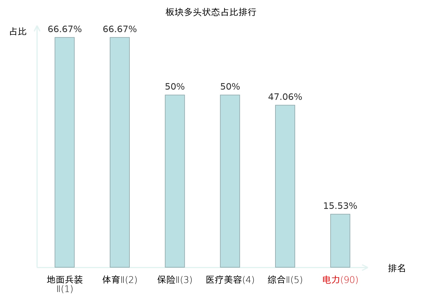 全市场所有行业板块中主力多头状态占比排名中,地面兵装Ⅱ板块位居第一。保险Ⅱ板块名次提升最快,较昨日上升82位。