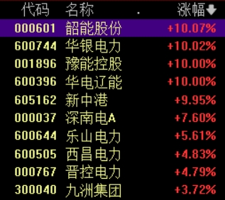 7月7日,电力股开盘走强,截至发稿,韶能股份、华银电力、新中港等多股涨停,深南电A涨7%,乐山电力、西昌电力等跟涨。