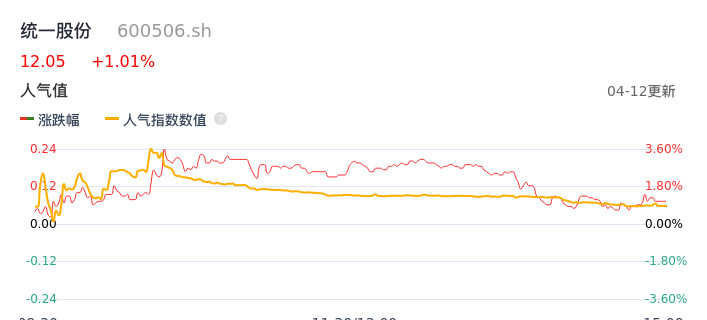 04月12日,统一股份收报12.05,股价涨幅1.01%,成交金额1.10亿元,换手率6.11%。