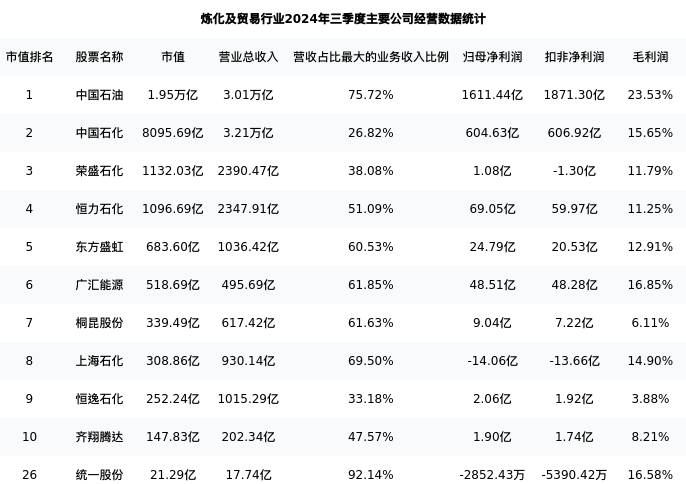 统一股份最新报告期数据为三季度,下表汇总了炼化及贸易行业内市值靠前的公司三季度主要经营数据