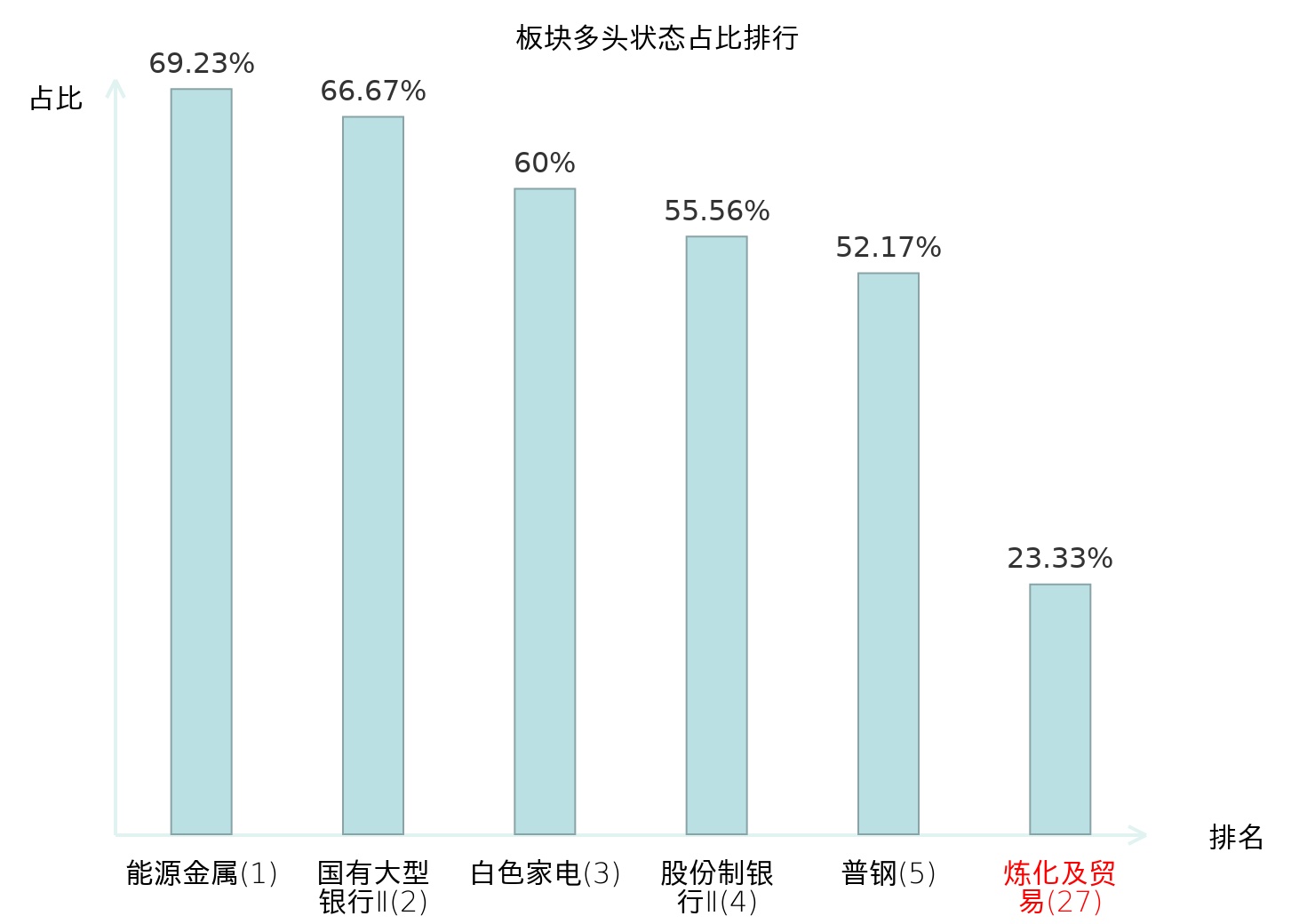 全市场所有行业板块中主力多头状态占比排名中,能源金属板块位居第一。贸易Ⅱ板块名次提升最快,较昨日上升69位。