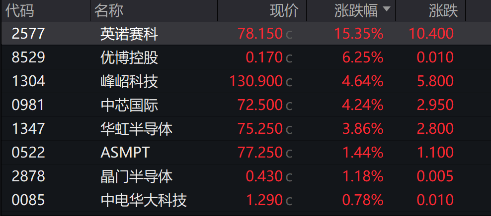 港股高开高走,恒生指数收盘涨0.86%,恒生科技指数涨1.74%,半导体股涨幅居前,中芯国际涨约4%,英诺赛科涨约15%。科技股、汽车股上涨,百度集团涨约9%,蔚来涨约2%。今日上市新股中,“Physical AI第一股”五一视界涨约30%,英矽智能涨约25%,林清轩涨约9%。