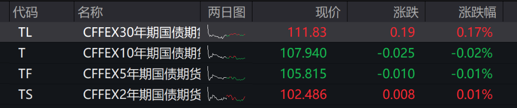 国债期货收盘表现分化,30年期主力合约涨0.17%报111.830元,10年期主力合约跌0.02%报107.940元,5年期主力合约跌0.01%报105.815元,2年期主力合约涨0.01%报102.486元。