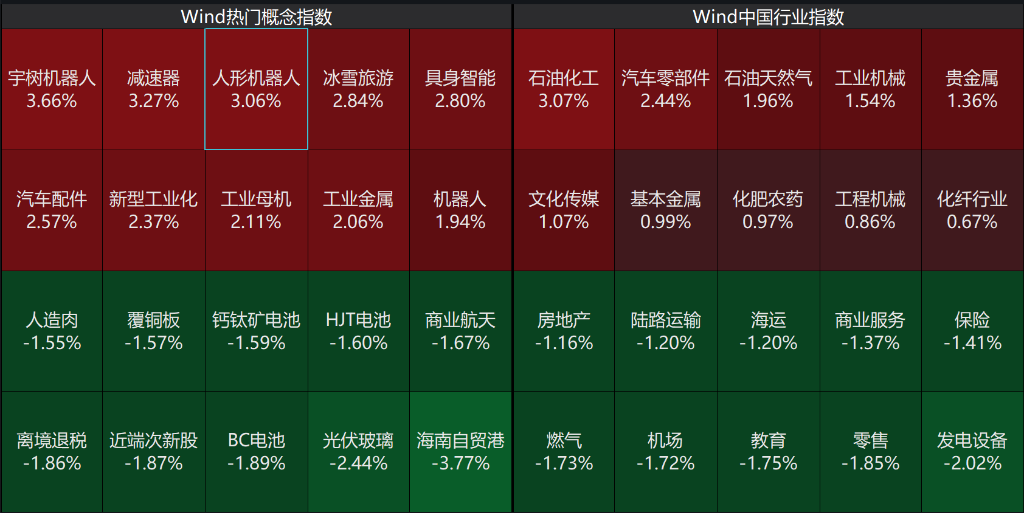 盘面上,两市共1734只个股上涨,65只个股涨停,3306只个股下跌。板块方面,机器人产业链与周期制造领涨,宇树机器人、减速器、人形机器人等概念全线走强,工业金属、石油化工等资源与重工业板块同步活跃;下跌方面,新能源与区域消费板块普遍调整,海南自贸港、光伏玻璃、商业航天领跌,地产、零售、保险等板块同步走弱。