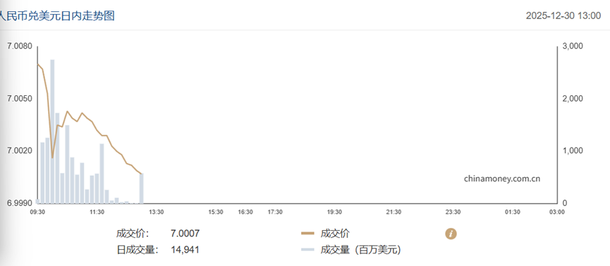 据华尔街见闻文章,12月30日,在岸人民币兑美元升破7.0关口,最高触及6.9960,涨幅达0.1%,创2023年5月17日以来最高水平。此前离岸人民币已在12月25日突破这一市场密切关注的心理关口。