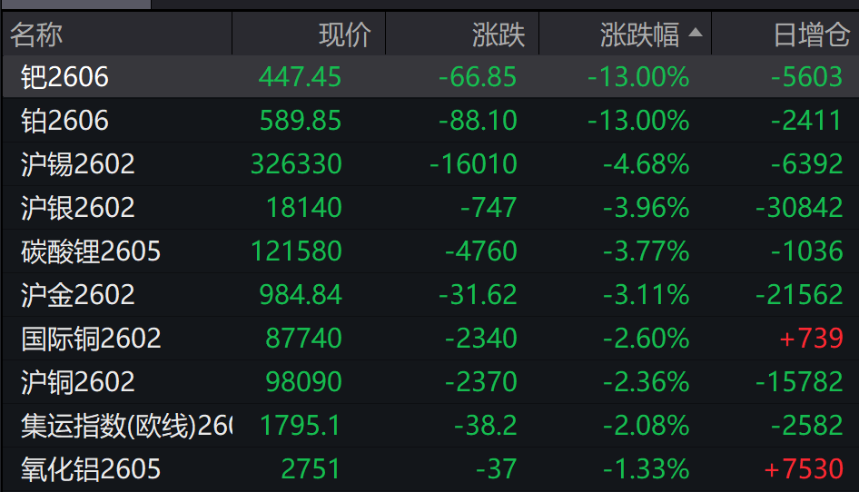 国内商品期市收盘涨跌参半,铂、铂跌停,沪银跌3.96%,沪锡跌4.68%,碳酸锂跌3.77%,集运指数(欧线)跌2.08%,玻璃涨3.23%,豆一涨1.56%,不锈钢涨1.28%,LPG涨0.64%。