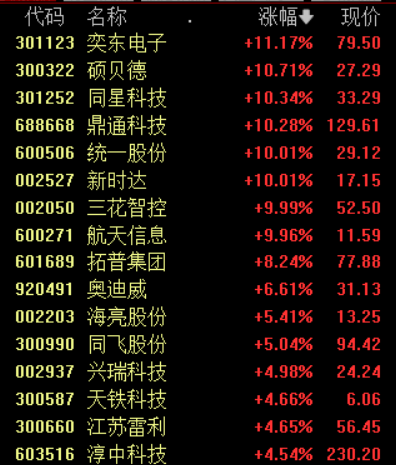 液冷服务器概念走高,统一股份、新时达等4股涨停,鼎通科技、奕东电子、硕贝德等多股涨超10%。