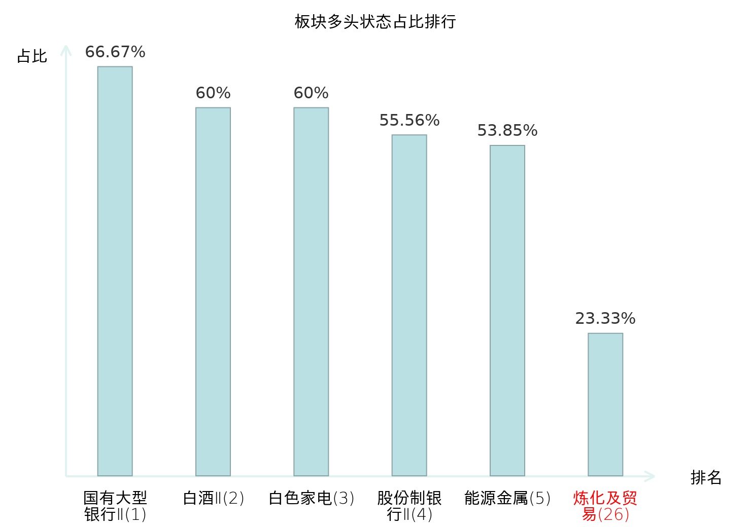 全市场所有行业板块中主力多头状态占比排名中,国有大型银行Ⅱ板块位居第一。电子化学品Ⅱ板块名次提升最快,较昨日上升55位。