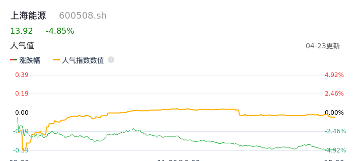 04月23日,上海能源收报13.92,股价涨幅-4.85%,成交金额1.49亿元,换手率1.46%。
