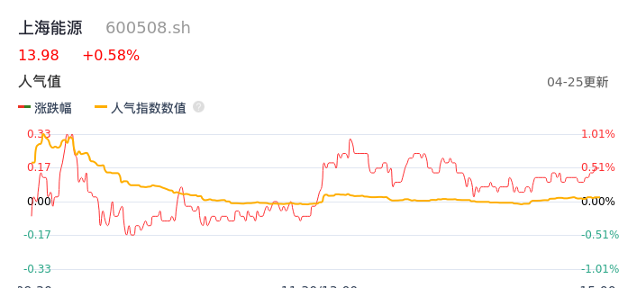 04月25日,上海能源收报13.98,股价涨幅0.58%,成交金额9086.17万元,换手率0.90%。