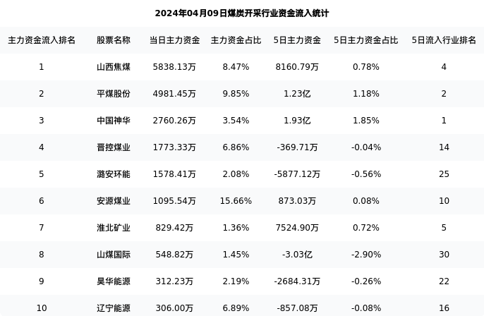 从主力资金流向来看,煤炭开采行业今日主力资金流入19.88亿元,在所有申万二级行业中排名:44/131。
