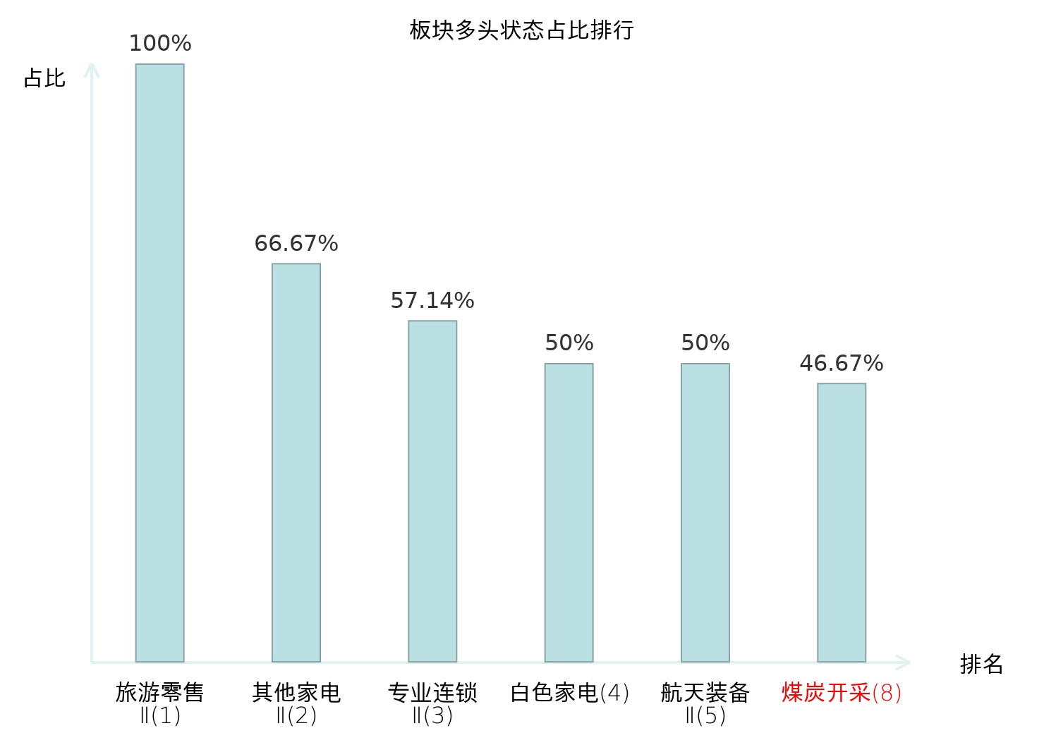 全市场所有行业板块中主力多头状态占比排名中,旅游零售Ⅱ板块位居第一。股份制银行Ⅱ板块名次提升最快,较昨日上升79位。