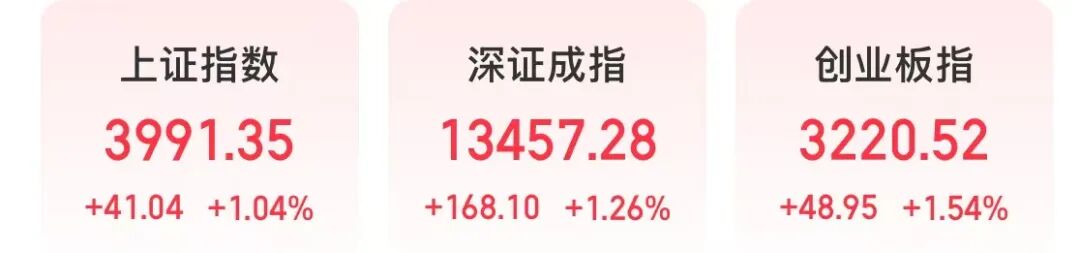 截至上午收盘,上证指数上涨1.04%,深证成指上涨1.26%,创业板指上涨1.54%。