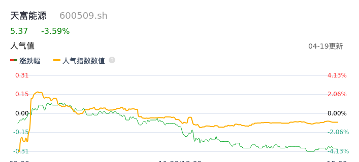 04月19日,天富能源收报5.37,股价涨幅-3.59%,成交金额1.75亿元,换手率2.32%。