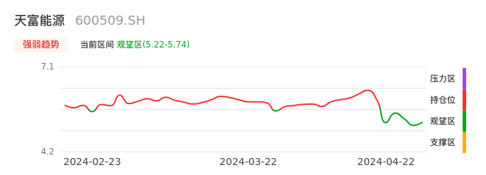 我们来看一下该股的九方特色指标强弱趋势的情况:天富能源自04月16日从持仓区下穿到观望区。股价近期持续下跌后,短期出现止跌迹象。后续重点关注能否再次站上多空分界点:5.74元。如未能有效突破则可能进入新一轮空头行情。