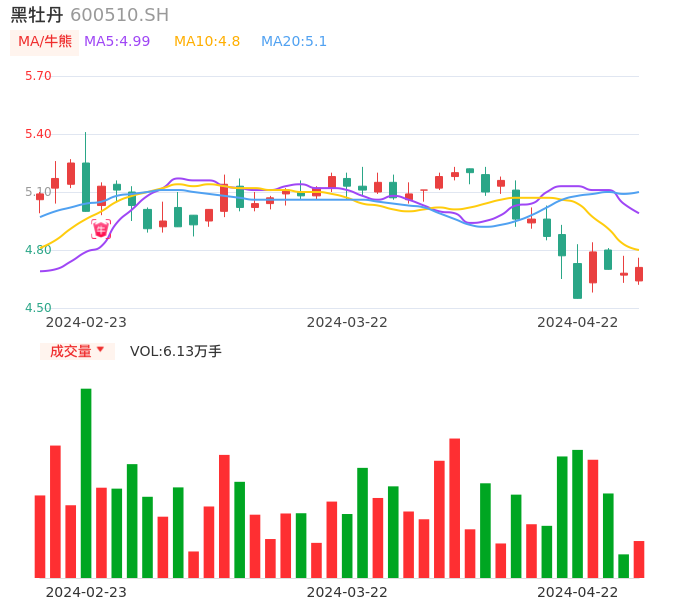 04月22日,黑牡丹收报4.71,股价涨幅0.64%,成交金额2884.06万元,换手率0.59%。