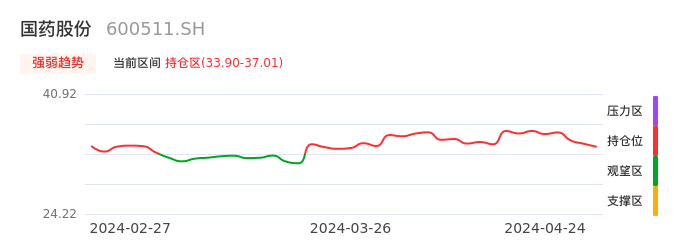 我们来看一下该股的九方特色指标强弱趋势的情况:国药股份自03月21日从观望区上穿到持仓区。股价近期在多头区域回调整理。后续重点关注多空分界点的争夺:33.90元。如未能有效站稳则可能重新回到空头行情。