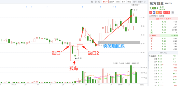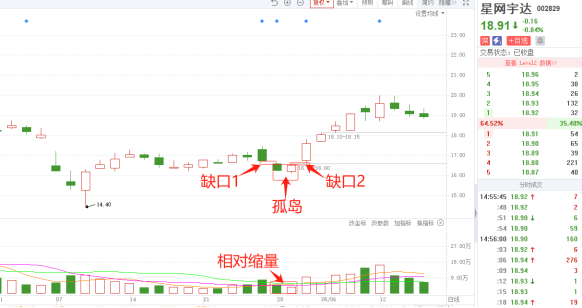 实用的岛形反转形态中,第一个缺口是向下的跳空缺口,随后缩量震荡走势居多,然后出现第二个缺口逆转向上,那么后续行情容易出现波段上涨过程。