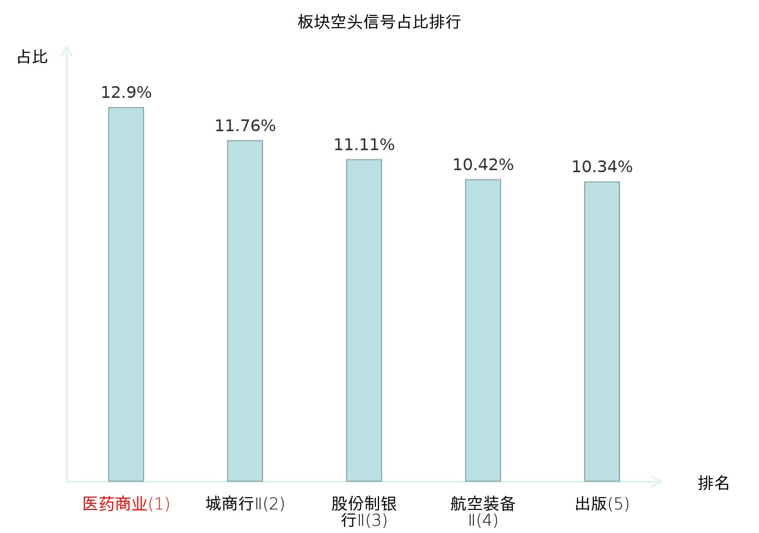 全市场所有行业板块中主力空头信号占比排名中,医药商业板块位居第一。城商行Ⅱ板块名次提升最快,较昨日上升102位。