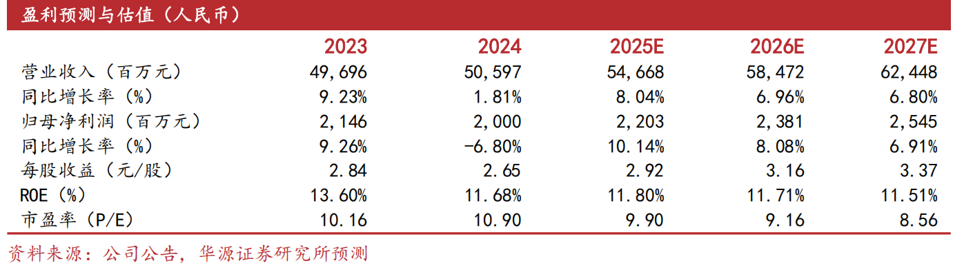 华源证券预计2025-2027年公司归母净利润分别为22.0亿元、23.8亿元、25.5亿元,增速分别为10.1%、8.1%、6.9%,当前股价对应的PE分别为10X、9X、9X。国药股份为麻精特药分销及北京地区医药商业龙头,麻精药配送业务有望保持稳健增长,同时有望受益于医药流通行业集中度提升带来的份额提升,