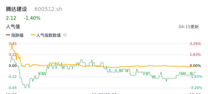 04月15日,腾达建设收报2.12,股价涨幅-1.40%,成交金额3499.30万元,换手率1.04%。