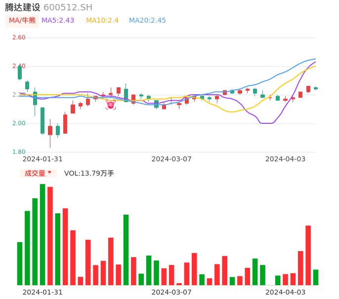 04月03日,腾达建设收报2.24,股价涨幅-0.88%,成交金额3089.58万元,换手率0.87%。