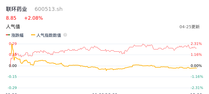 04月25日,联环药业收报8.85,股价涨幅2.08%,成交金额4522.89万元,换手率1.80%。