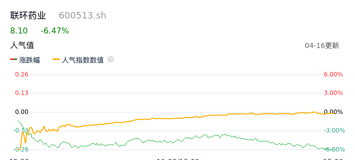 04月16日,联环药业收报8.10,股价涨幅-6.47%,成交金额8172.02万元,换手率3.46%。