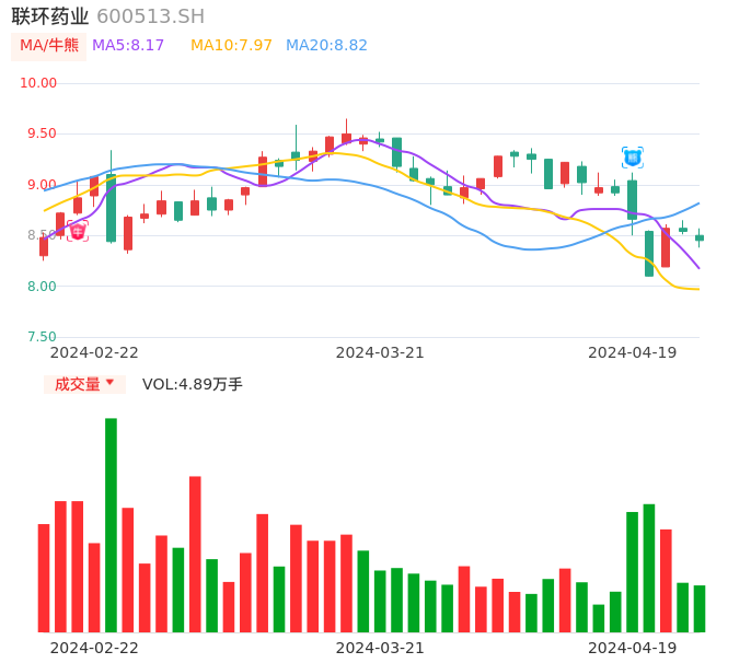 04月19日,联环药业收报8.45,股价涨幅-1.05%,成交金额4130.74万元,换手率1.71%。