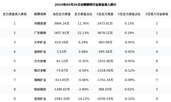 从主力资金流向来看,冶钢原料行业今日主力资金流入4.16亿元,在所有申万二级行业中排名:81/131。