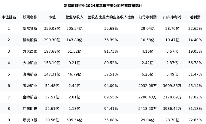 方大炭素最新报告期数据为年报,下表汇总了冶钢原料行业内市值靠前的公司年报主要经营数据