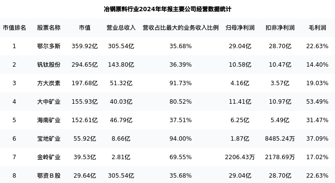 方大炭素最新报告期数据为年报,下表汇总了冶钢原料行业内市值靠前的公司年报主要经营数据