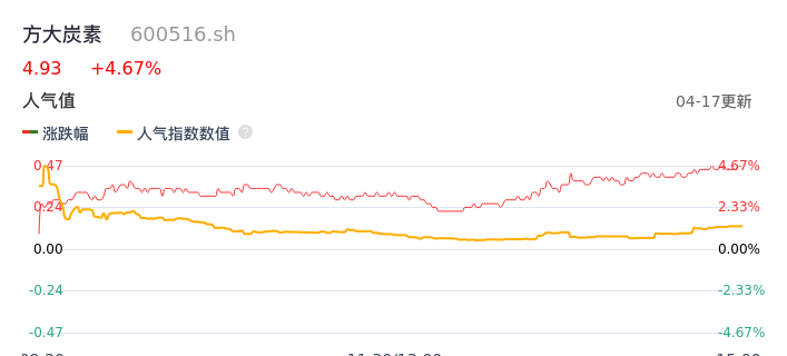 04月17日,方大炭素收报4.93,股价涨幅4.67%,成交金额1.41亿元,换手率0.72%。