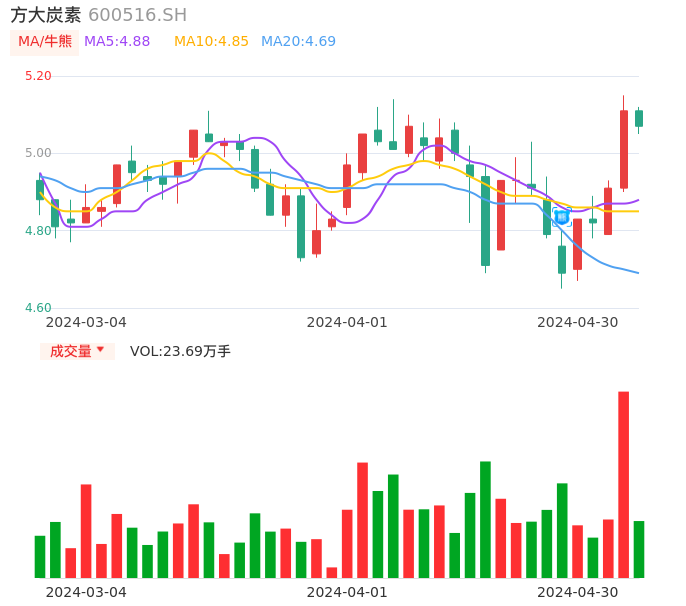 04月30日,方大炭素收报5.07,股价涨幅-0.78%,成交金额1.20亿元,换手率0.59%。