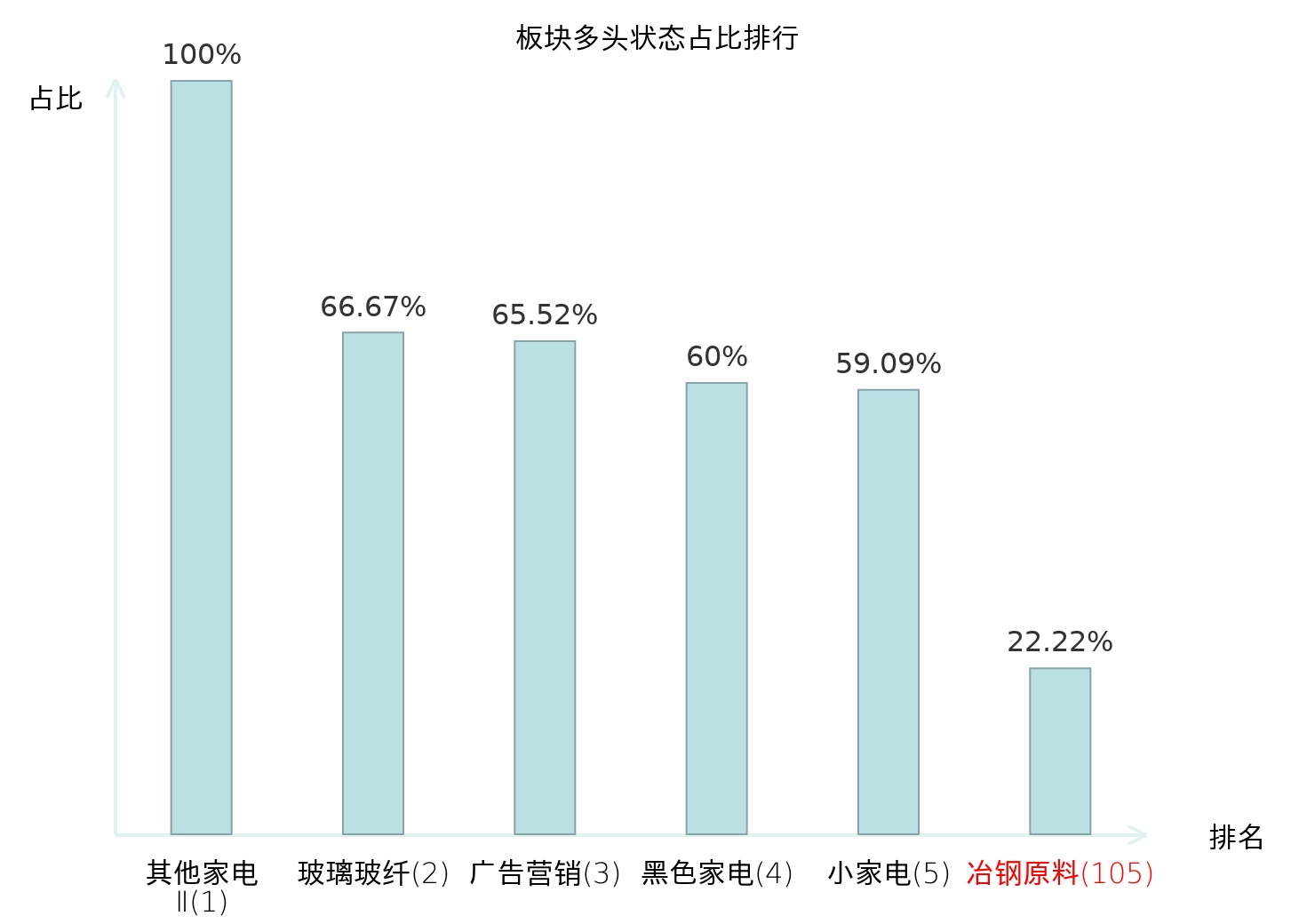 全市场所有行业板块中主力多头状态占比排名中,其他家电Ⅱ板块位居第一。航天装备Ⅱ板块名次提升最快,较昨日上升79位。