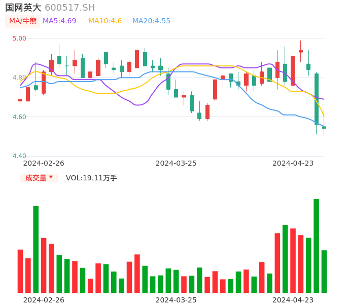 04月23日,国网英大收报4.54,股价涨幅-0.44%,成交金额8719.14万元,换手率0.33%。