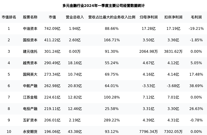 国网英大最新报告期数据为一季度,下表汇总了多元金融行业内市值靠前的公司一季度主要经营数据