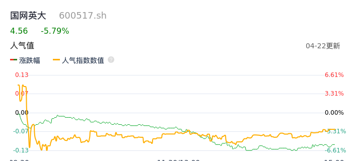 04月22日,国网英大收报4.56,股价涨幅-5.79%,成交金额1.68亿元,换手率0.63%。