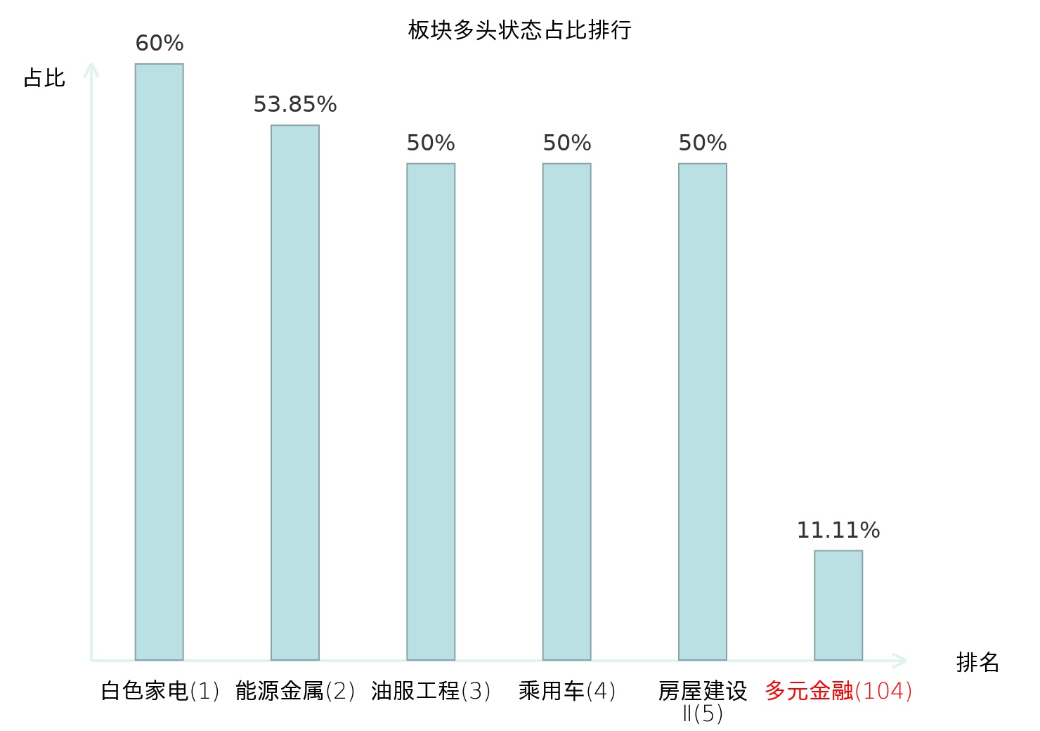 全市场所有行业板块中主力多头状态占比排名中,白色家电板块位居第一。油气开采Ⅱ板块名次提升最快,较昨日上升45位。