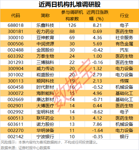 近两日(7月8日至7月9日)共有67家公司公告机构调研记录,其中,19家公司有10家及以上机构扎堆调研,参与调研机构家数最多的是乐鑫科技,共126家机构调研,佐力药业、豆神教育分别有88家、69家机构调研。