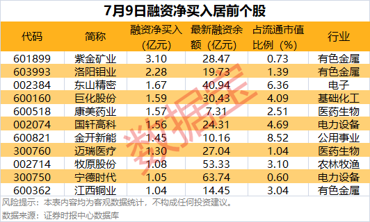 具体到个股,7月9日获融资净买入千万元以上的有434只,其中11只融资净买入额超1亿元。紫金矿业融资净买入额居首,当日净买入3.10亿元,其次是洛阳钼业、东山精密,融资净买入金额分别为2.28亿元、1.67亿元,融资净买入金额居前的还有巨化股份、康美药业、国轩高科等。