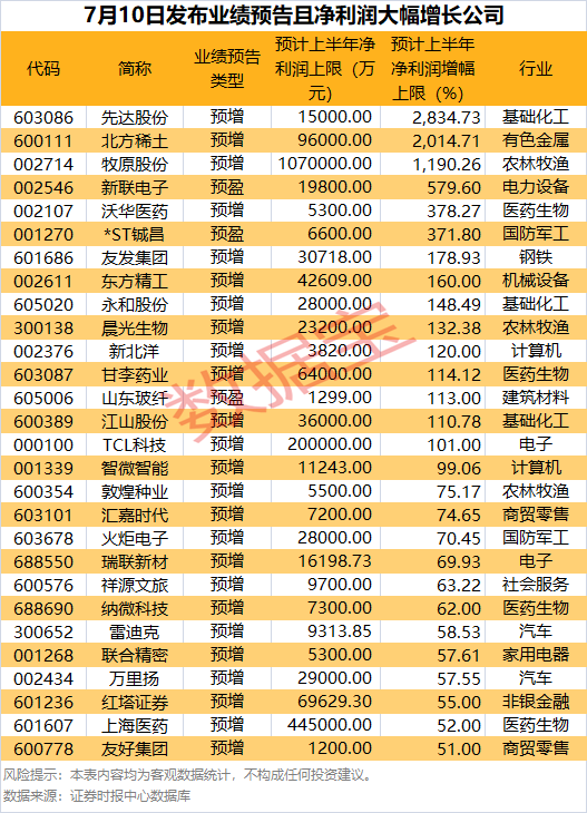 以预计净利润增幅上限统计,共15家公司预计净利润增幅超100%,先达股份、北方稀土等预计上半年净利润增幅超20倍,牧原股份上半年净利润增近12倍。