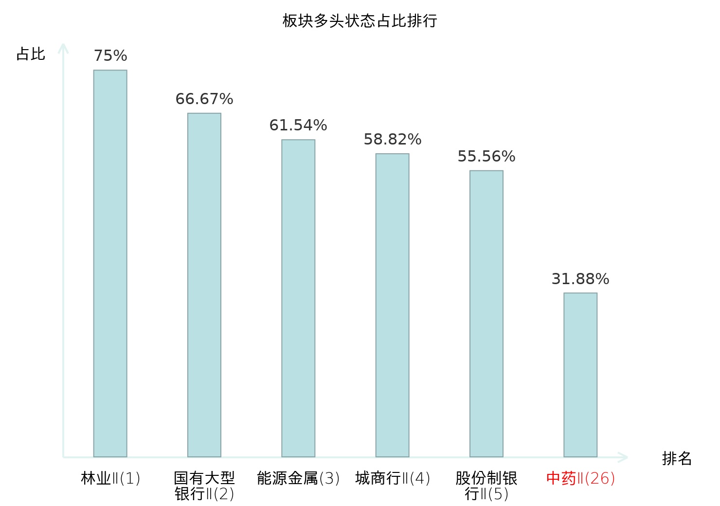 全市场所有行业板块中主力多头状态占比排名中,林业Ⅱ板块位居第一。专业连锁Ⅱ板块名次提升最快,较昨日上升63位。