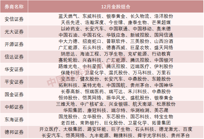 从整体行业分布情况看,后市配置价值持续获得机构看好的医药生物和电子行业,12月入围券商金股组合的公司数量分别为12家和11家;机械设备、汽车两大周期性行业,12月入围券商金股组合的公司数量均为8家;石油石化行业有4家公司入围券商12月金股组合;计算机、传媒、食品饮料、通信等行业,入围券商12月金股组合的公司数量居各行业前列。不过,银行、轻工制造、美容护理等行业,券商“金股”数量则较少。