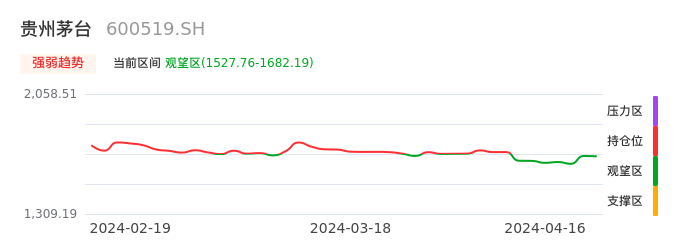 我们来看一下该股的九方特色指标强弱趋势的情况:贵州茅台自04月08日从持仓区下穿到观望区,股价近期持续走弱。短期已经进入空头行情,且下跌动能仍未衰竭。建议继续谨慎观望。