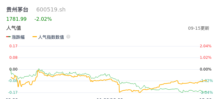 09月15日,贵州茅台收报1781.99,股价涨幅-2.02%,成交金额51.06亿元,换手率0.23%。